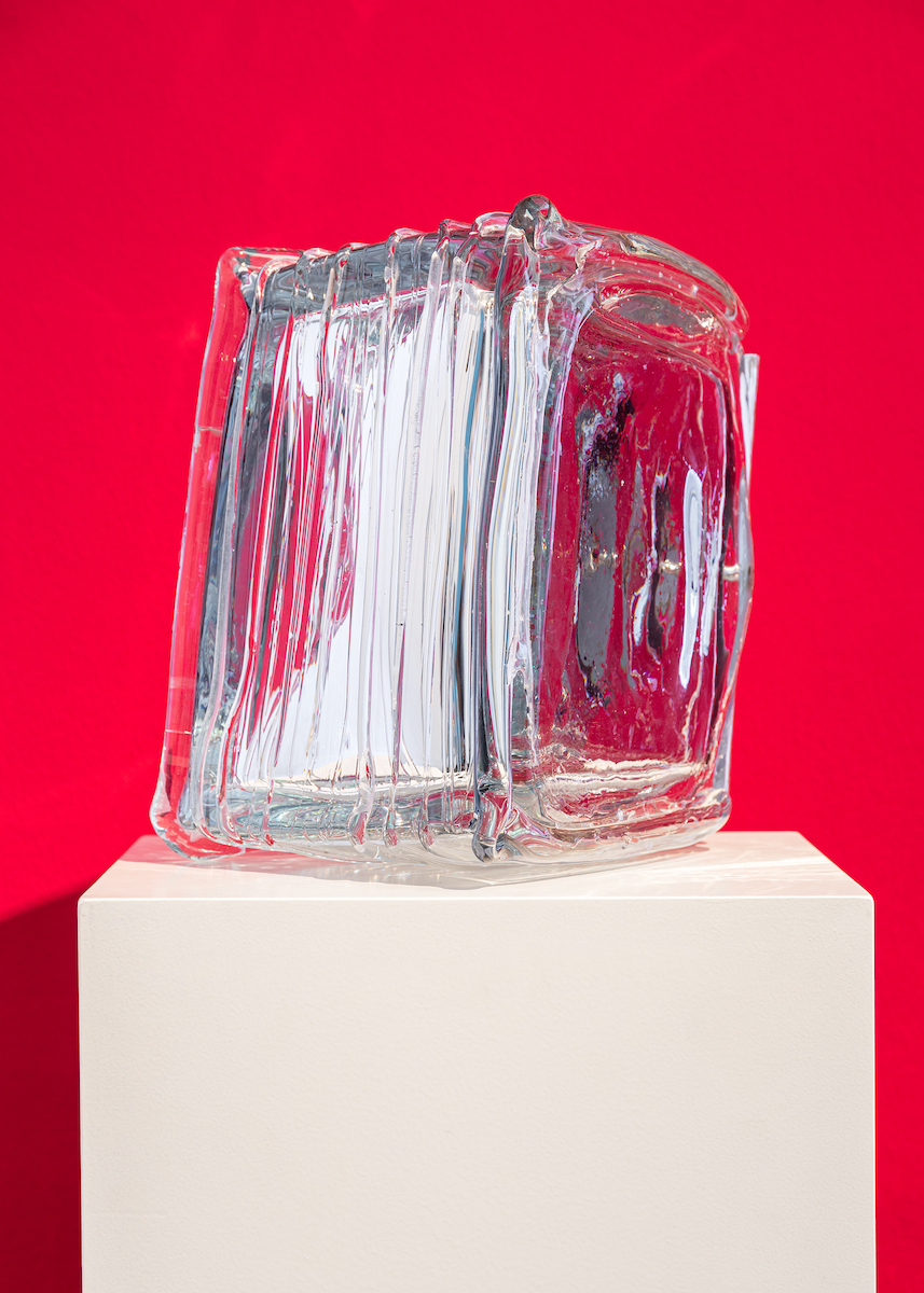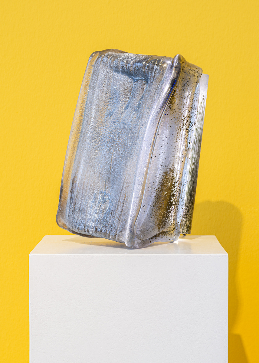 Ein spannendes Zusammenspiel zu den Publikationen und der Grafikmappe bilden die Lichtskulpturen von Federica Marangoni (geb. 1940). Die konzeptuell arbeitende Künstlerin kreiert Glasskulpturen und große Installationen bei denen sie technische Medien, wie Video und Neolicht kombiniert. Marangoni lebt in Venedig, wo das spezielle Murano Glas allgegenwärtig ist. Ein Hauptwerk bildet die Installation »Archive of my Memory«, ein gläsernes Buch aus Marangonis Serie »Library« zwischen deren hauchdünnen Seiten aus Glas Licht und Text projiziert wird. Das Materielle des Glases und das Immaterielle des Lichts bilden eine Symbiose bei der das historische Vermächtnis der Texte mit einer poetischen Erinnerung verschmilzt.