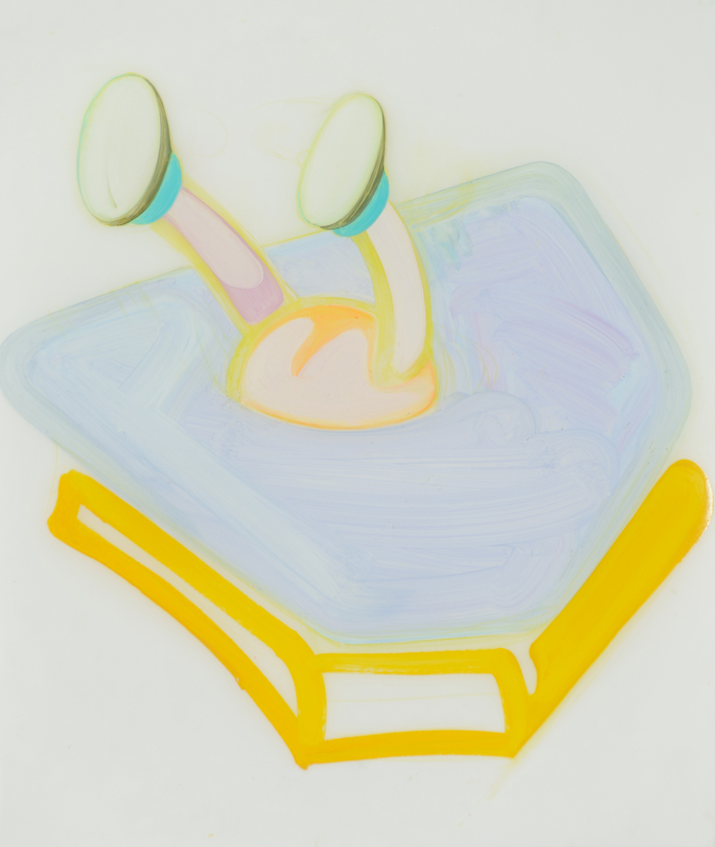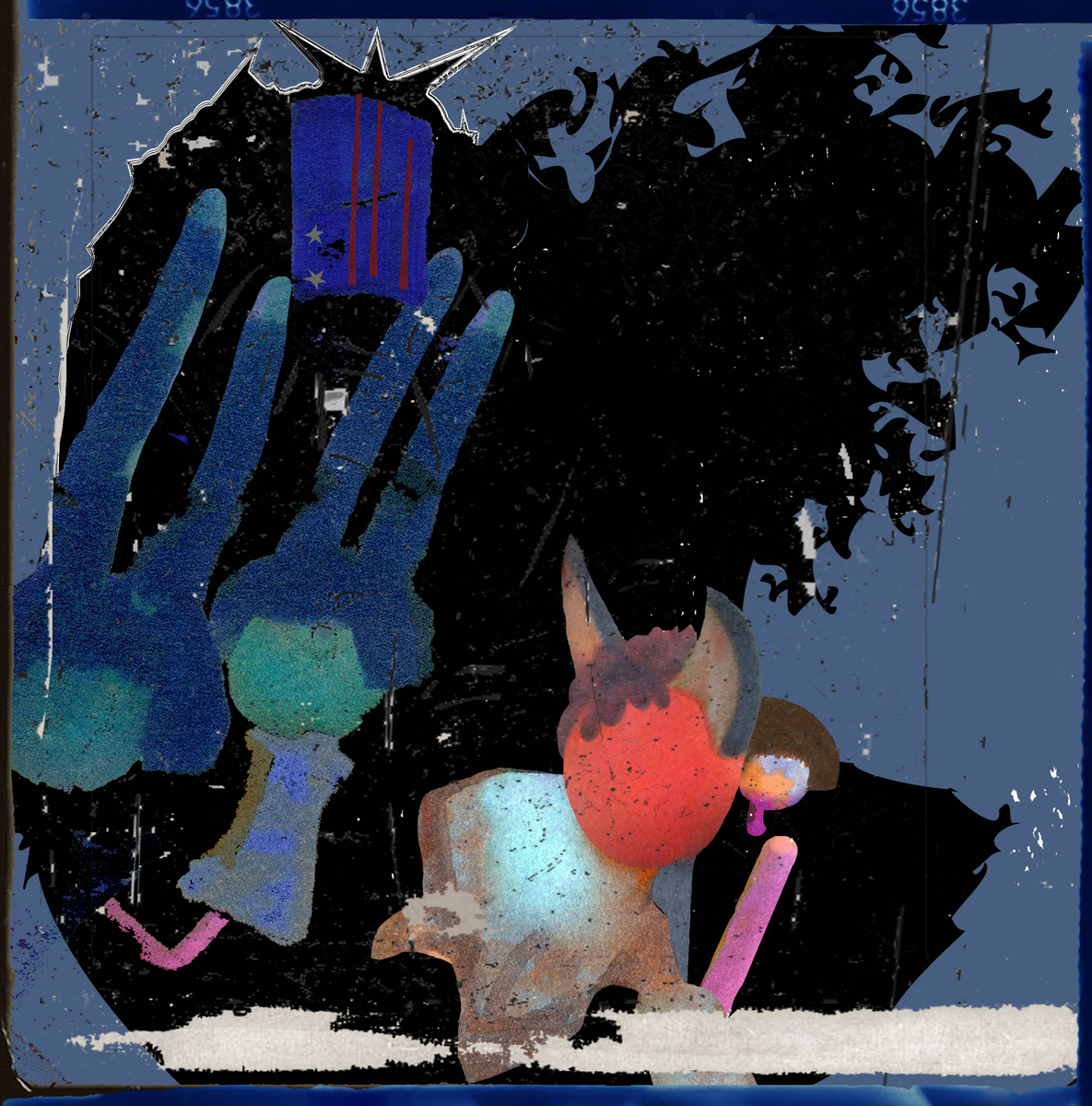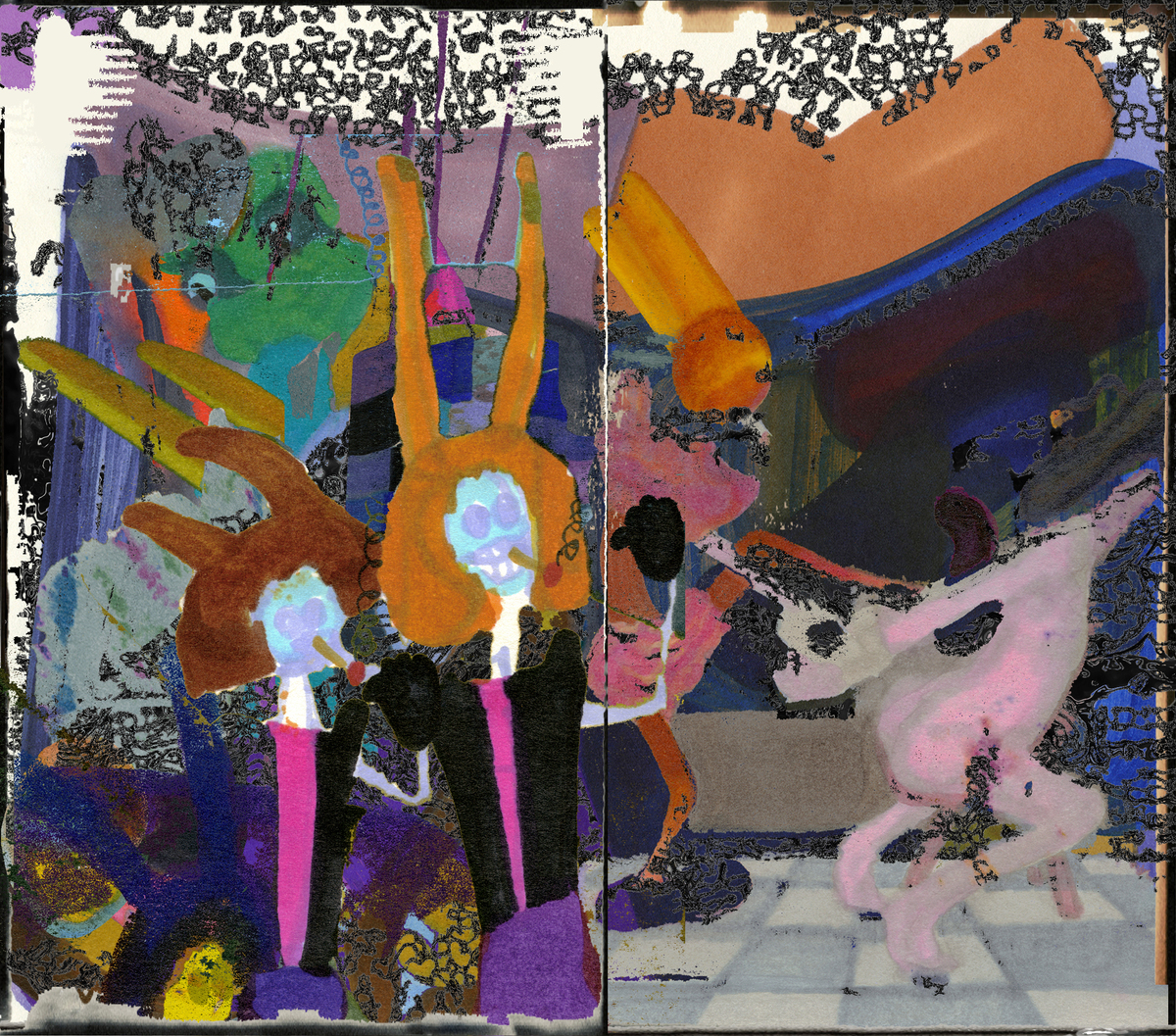 Was als analoge Zeichnung und Malerei entstand, wird in einem Prozess, der viele Zufälle zulässt, digitalisiert weiterverarbeitet, dabei sehr weit getragen und anschließend per Pigmentdruck auf Diascreen – das heißt auf Diafilm – ausgedruckt. Eine digital-analoge Collage aus Malerei und Photoshop endet solc...