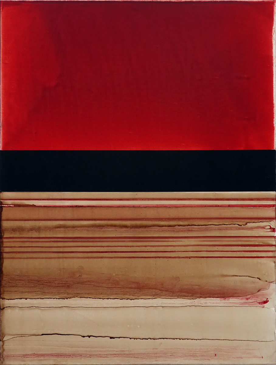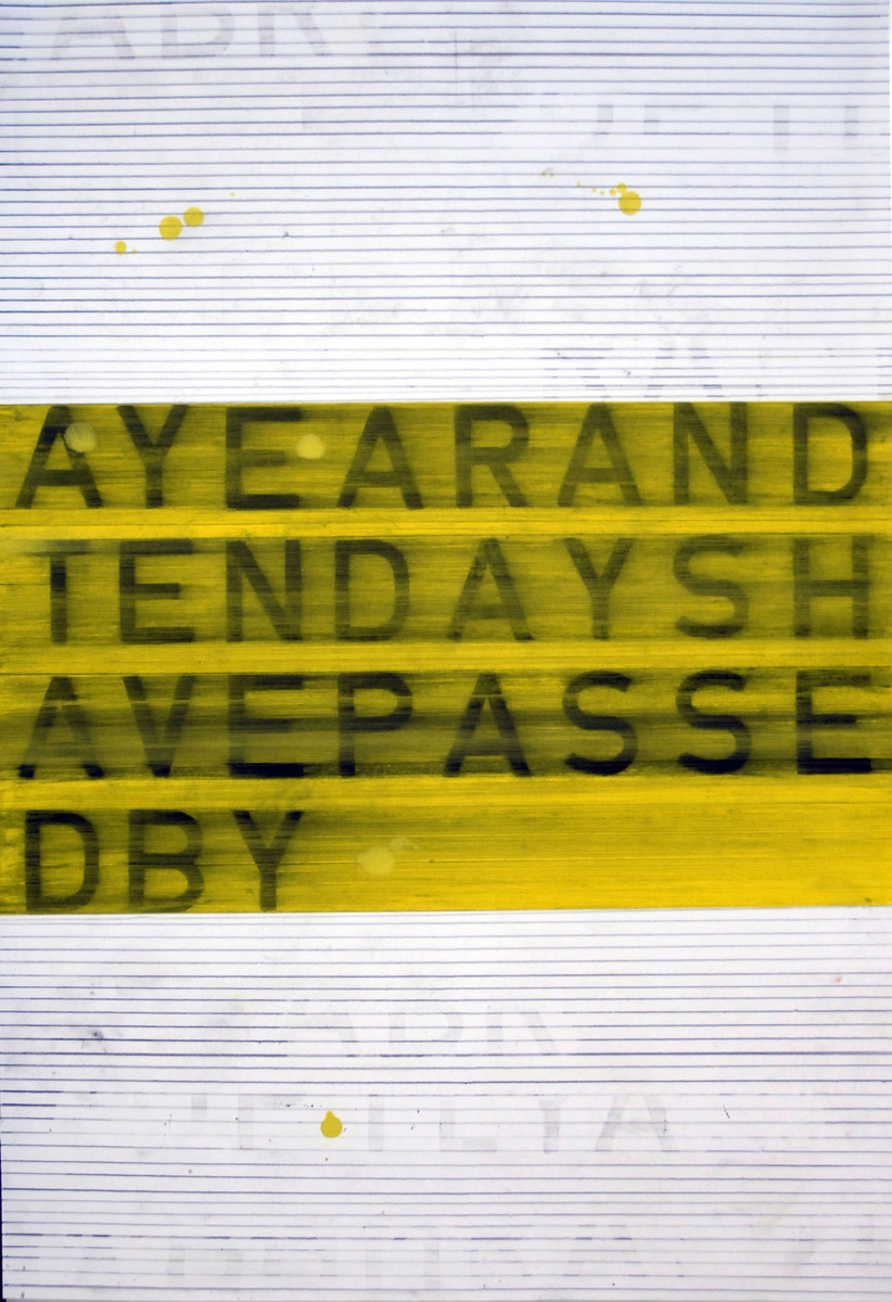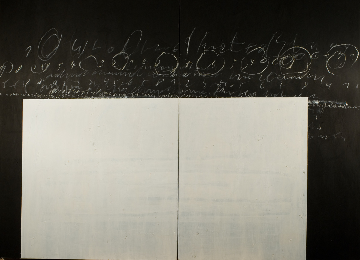 Eine die Ausstellung durchdringende Dimension ist, für eine Rückschau durchaus angemessen, die Zeit bzw. ihr Vergehen. Mehr jedoch, als sich als sinnstiftender Moment zu erschöpfen, ist der zeitliche Aspekt allen Werken Palavrakis’ immanent. Etwa wenn der Künstler den Prozess ihrer Entstehung seinen Werken als formale Grundkategorie einschreibt. Übermalungen, Abtragungen, Wischer, Farbverläufe, all diese Spuren des kreativen Prozesses, der ja auch einen zeitlichen Verlauf darstellt, werden in den Arbeiten zum bildgebenden Element. Auf einer anderen Ebene, eine Art inhaltlichen, steht die Schrift, als bildlich gewordene Sprache und die Zeiten überspannender Informationsspeicher, im Zentrum der hier gezeigten Arbeiten. Jedoch: was sich uns an schriftlichen Überlieferungen in Palavrakis’ Werken zeigt, lässt sich selten entziffern, steht aus Kontexten gelöst, verblasst, wird überdeckt und verwischt. Das Vergehen der Zeit, das auch mit einem Verschwinden und Auflösung einhergeht.
