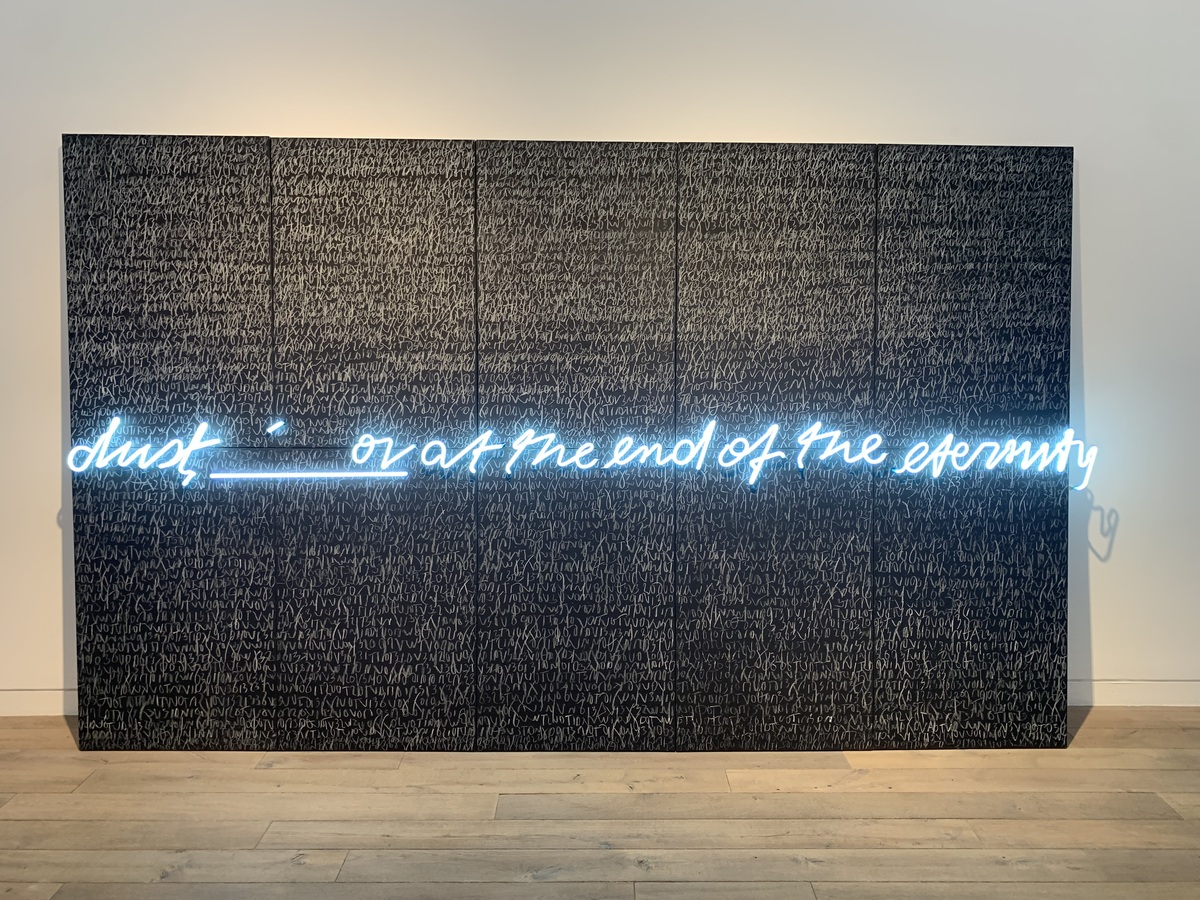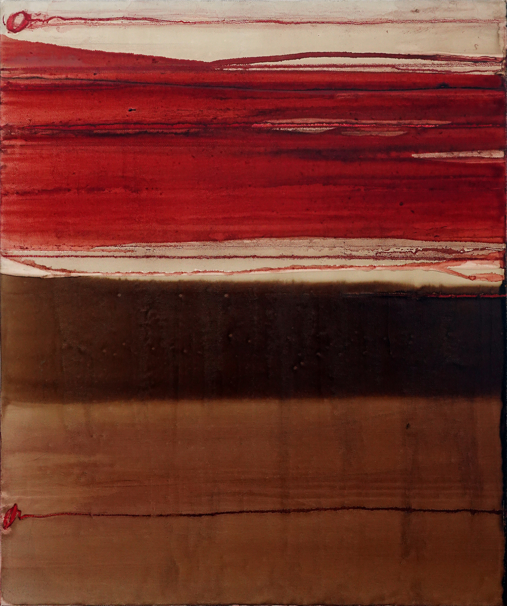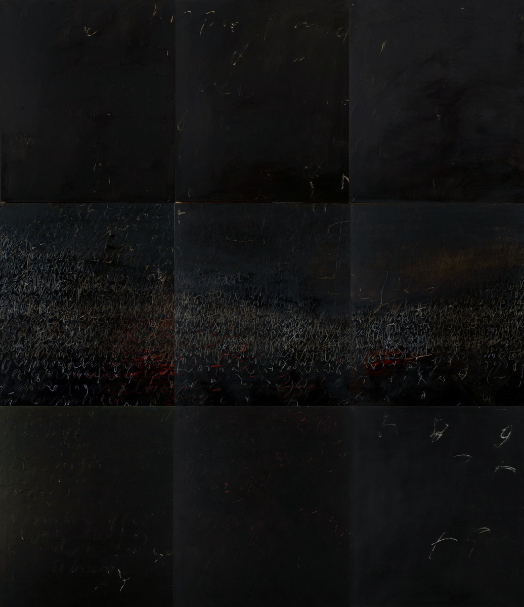 Eine die Ausstellung durchdringende Dimension ist, für eine Rückschau durchaus angemessen, die Zeit bzw. ihr Vergehen. Mehr jedoch, als sich als sinnstiftender Moment zu erschöpfen, ist der zeitliche Aspekt allen Werken Palavrakis’ immanent. Etwa wenn der Künstler den Prozess ihrer Entstehung seinen Werken als formale Grundkategorie einschreibt. Übermalungen, Abtragungen, Wischer, Farbverläufe, all diese Spuren des kreativen Prozesses, der ja auch einen zeitlichen Verlauf darstellt, werden in den Arbeiten zum bildgebenden Element. Auf einer anderen Ebene, eine Art inhaltlichen, steht die Schrift, als bildlich gewordene Sprache und die Zeiten überspannender Informationsspeicher, im Zentrum der hier gezeigten Arbeiten. Jedoch: was sich uns an schriftlichen Überlieferungen in Palavrakis’ Werken zeigt, lässt sich selten entziffern, steht aus Kontexten gelöst, verblasst, wird überdeckt und verwischt. Das Vergehen der Zeit, das auch mit einem Verschwinden und Auflösung einhergeht.