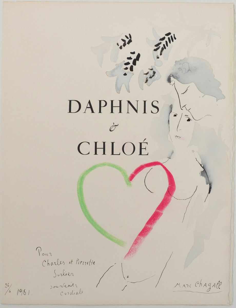 Zwei besondere Zeichnungen von Marc Chagall, die auf dem Frontispiz und der ersten Buchseite des bedeutenden grafischen Werkes „Daphnis und Chloé“ festgehalten wurden, werden ebenfalls in dieser Ausstellung präsentiert. Sie zeigen ein Liebespaar und weitere Symbole wie der Ziegenbock und der Hahn – kompositorische Elemente, die im Werk Chagalls zeitlebens charakteristisch und immer auch autobiografisch zu lesen sind. Die leichte, scheinbar mühelose Strichführung mit Tusche, Aquarell und Farbstift unterstreicht dabei, wie so oft, die Ebene der Träume und Sehnsüchte.
