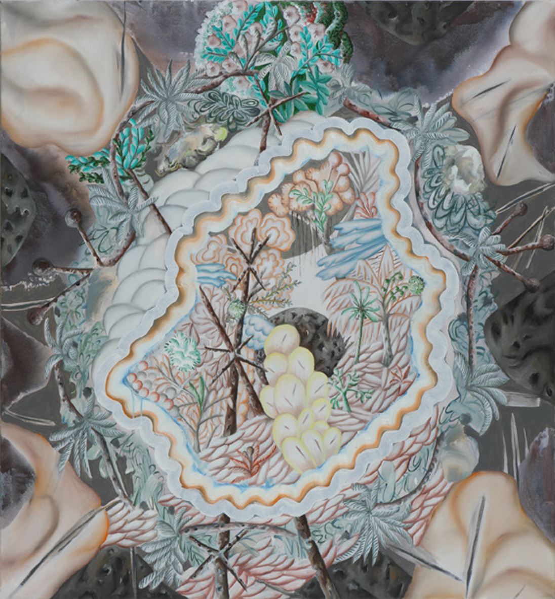 He thereby presents an abstract, sculptural, utopian and staged view on nature. The almost inexhaustible abundance of forms is borne by the idea of the chamber of art and curiosities where "artificialia" and "naturalia" were closely interlocked, like in a microcosm of the universe. Neumann's mysterious process of creation is characterised by opulence and an exuberant wealth of detail. It is a hermetic place, far away from any place that can be experienced in reality. Though this artificial nature seems to be beyond any comparison. He invents a new law for nature derived from painting. The development of artificiality as nature and of nature as artefact accounts for Hartmut Neumann's singular position within the contemporary art world.