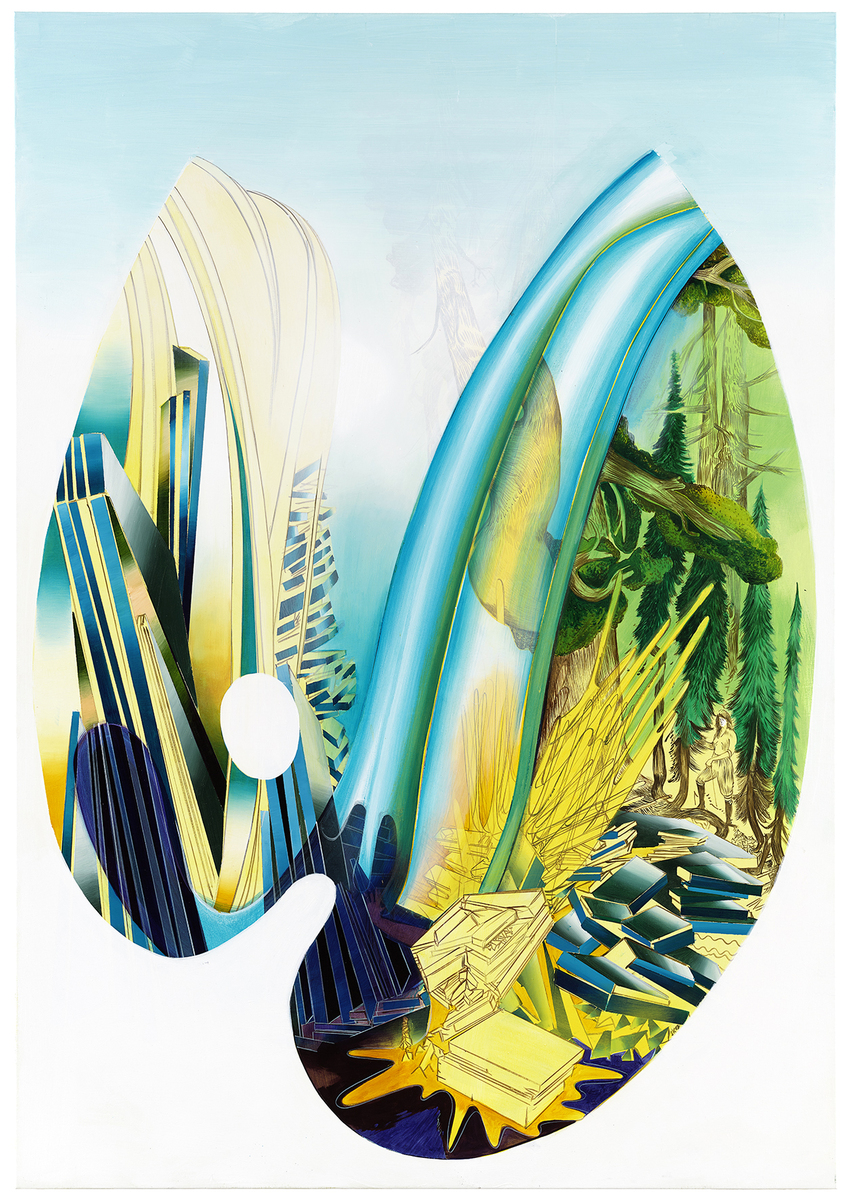 Her new paintings CYBERPALETTE I and II, are based on a luminous yet reduced color range that developed out of Kühn’s exploration of the idea of drawing over the past two years. Here, newly invented palette forms take on a sensuous character, seeming like floating, computer-generated organs in historically allusive spaces.