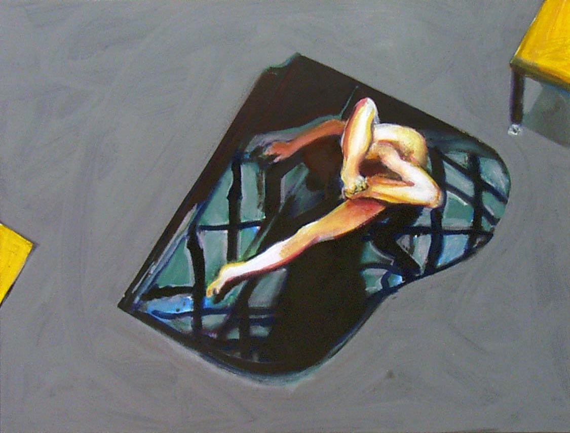 Looking at the canvases of Norbert Tadeusz, each one celebrating colour and painting itself, it might surprise that he studied under Joseph Beuys at the Akademie. The monumental Gelbes Atelier shows Taduesz' preference for the large format. It is also a typical 'Tadeusz-Szene' – almost surreal scenes that he creates by merging diferent pictoral elements of his iconographic vocabulary into a new composition. Hoehme was one of the leading fgures of the German Informel-movement and held a professorship at the Akademie (where Chris Reinecke and Sigmar Polke were two of his students). He soon freed his work from the rather strict principles of Informel and created a very genuine oeuvre, with PE-cords looming from the canvases becoming his signature style. The cords were not only meant to extend the pictoral space, but also to create relations with the beholder.